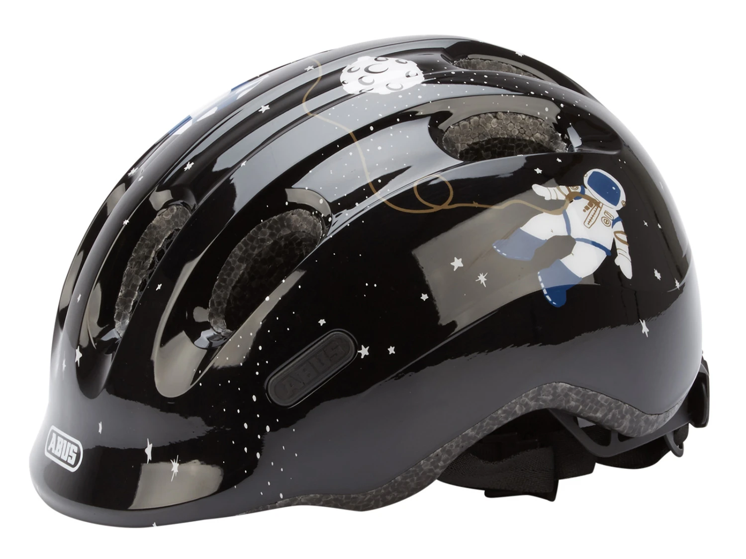 Smart Smiley 2.0 cykelhjälm i en snygg, svart färg, med mönster av en man i rymden. Hjälmen är en uppdatering av den första Abus Smiley-modellen. Denna har en ännu bättre säkerhet samt en ny design. Cykelhjälmen skyddar extra bra i området runt tinningarna samt har en ”rak nacke”, vilket gör den särskilt väl ämnad i cykelstolar och cykelkärror.