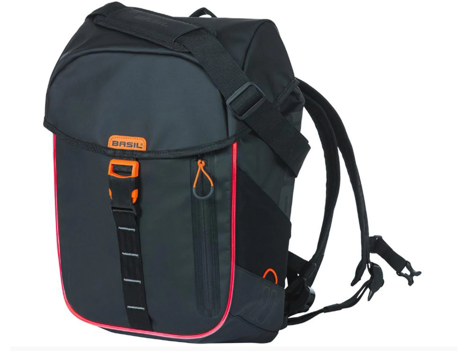 Med denna ’Miles Tarpaulin’-ryggsäck från Basil får du en ryggsäck och cykelväska i ett, vilket innebär att du har möjlighet att bära ryggsäcken på ryggen eller använda den som en cykelväska.