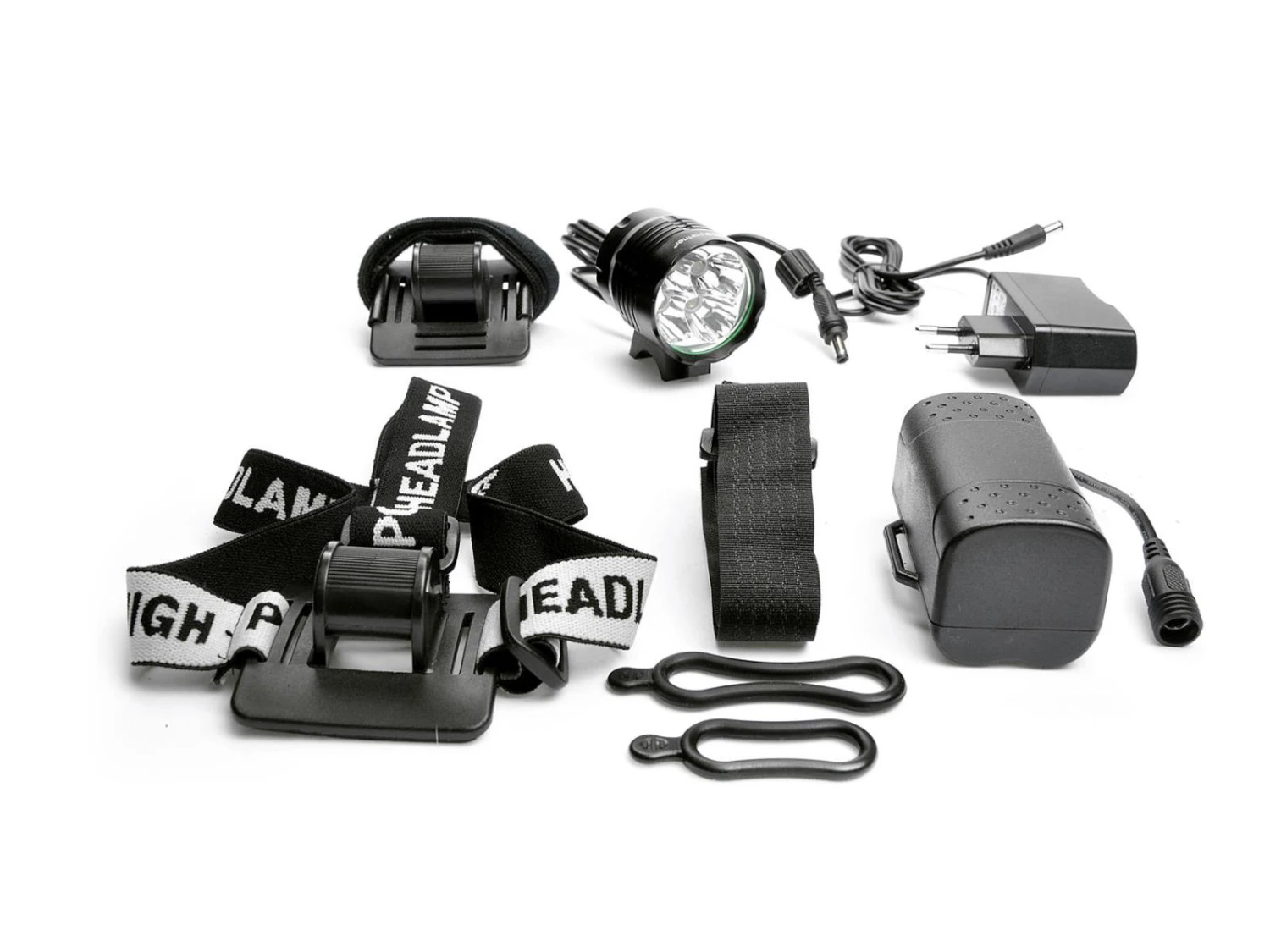 Paketet innehåller 1 st. pannband med fäste, 1 st. hjälmfäste, 1 st. laddare för 220v och 1 st. litiumbatteri på 7,4 V 4400mAH.