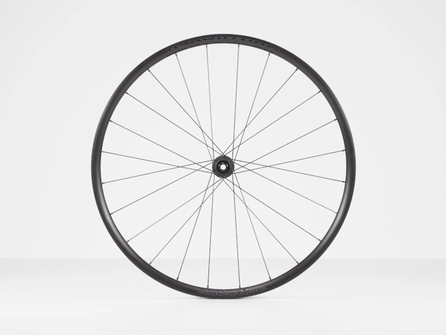 Detta ’Paradigm Comp Disc TLR’ framhjul från Bontrager är lämpligt för landsvägscykling och har en något bredare fälg, vilket stödjer bättre hastighet och komfort.