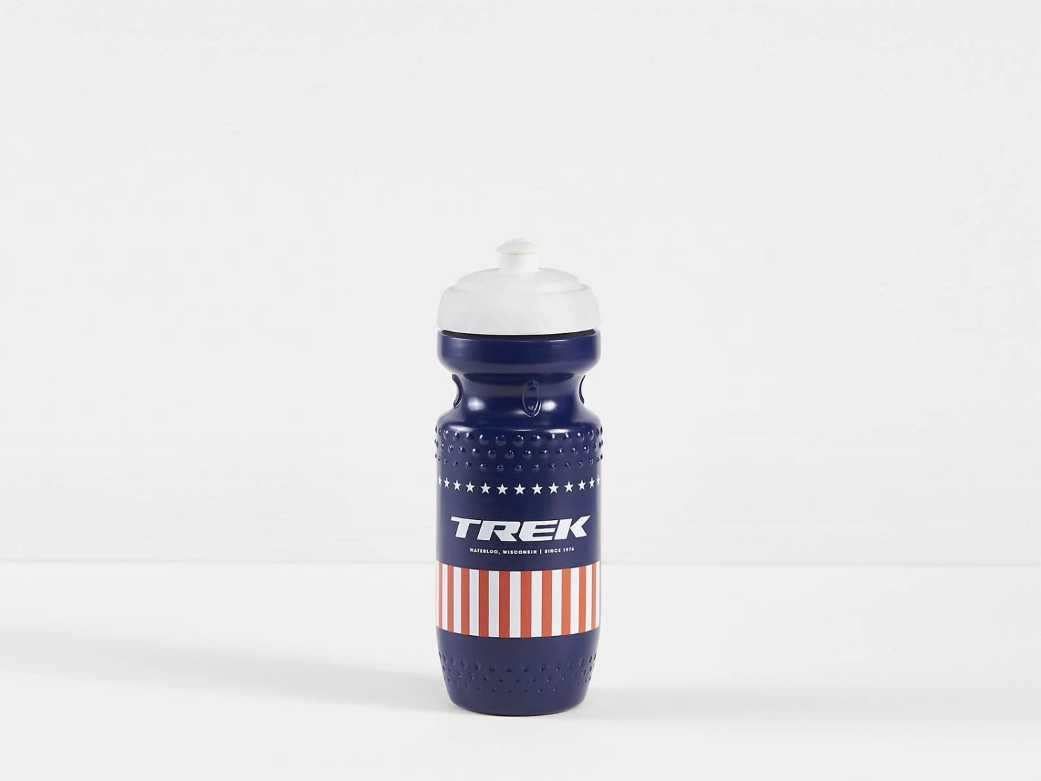 Trek Stars and Stripes dricksflaska är en mörkblå dricksflaska, som är dekorerad med inspiration från den amerikanska flaggan. Vattenflaskan finns i två olika storlekar och har en 100% läcksäker design. Formen gör det lätt att pressa ut vätskan och öppningen är extra stor så det är lätt att fylla på isbitar eller energipulver.
