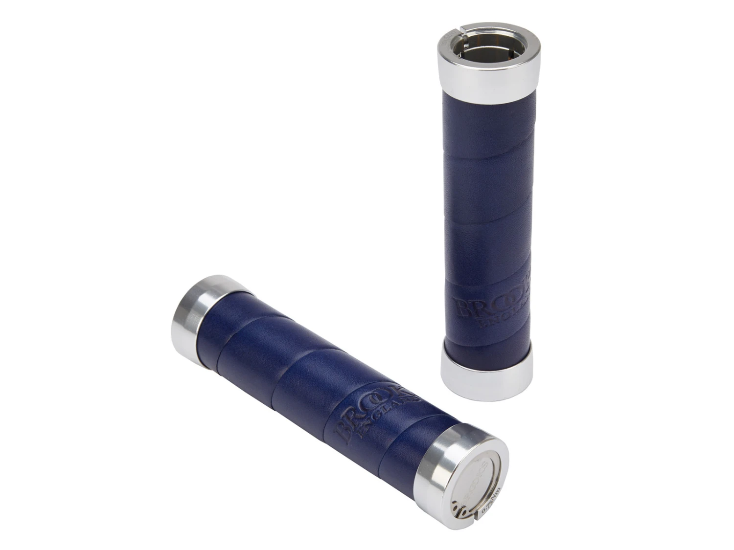 Brooks läderhandtag i blått. Handtagen är tillverkade av blå läderband.