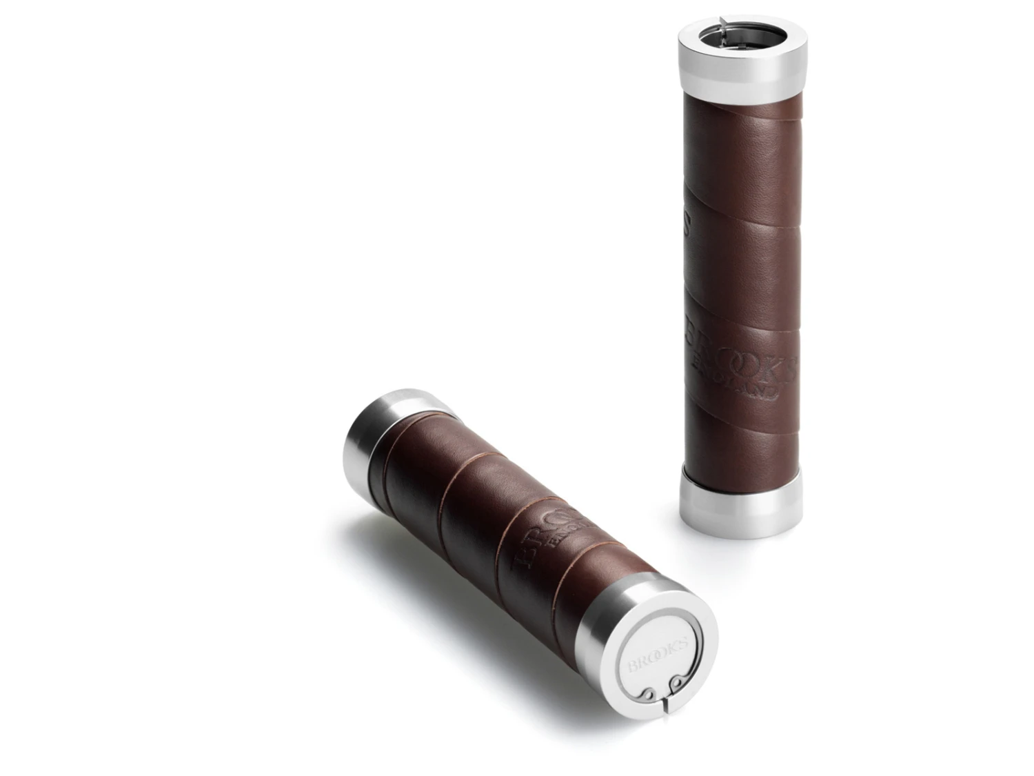 Här får du en uppsättning av slanthandtag från Brooks, som har en riktigt bra komfort, eftersom materialet är läder, som är bundet runt handtaget och tillslutet med aluminiumkappar i ändarna. Båda handtagen är 130 mm långa.