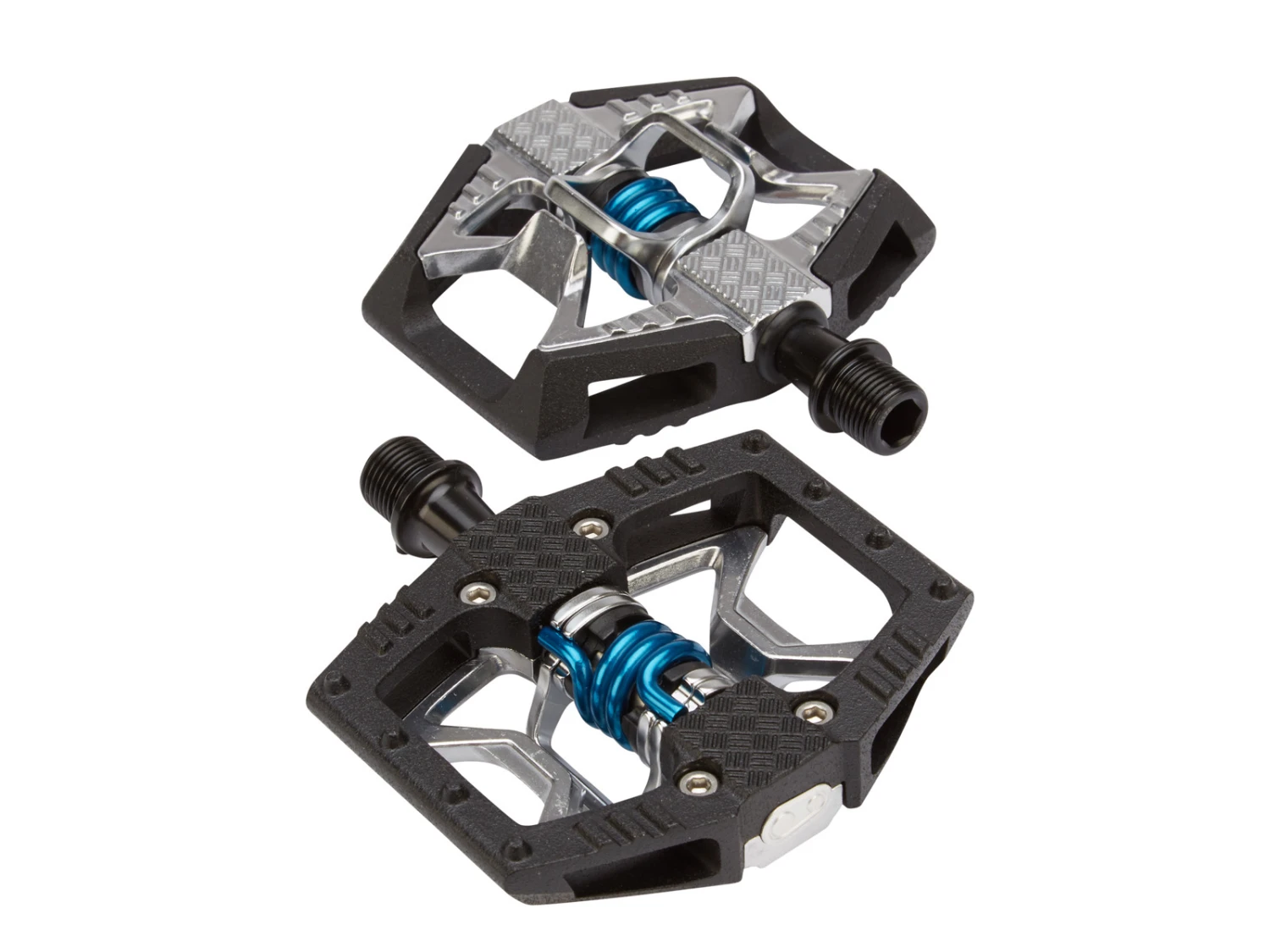 Denna Crankbrothers MTB-kombinationspedal kan användas med sneakers eller vanliga skor. På ena sidan kan du klicka på skon där den andra är helt platt och för vanliga skor. Den plana sidan är utrustad med stift och ränder som hjälper dig att få ett bra grepp. Double Shot-pedalerna är enkla att klicka in och dessutom med starka lager. Crankbrothers Double Shot är ett självklart val när du är nybörjare när du väljer pedaler. Klämmor kommer med dessa pedaler.