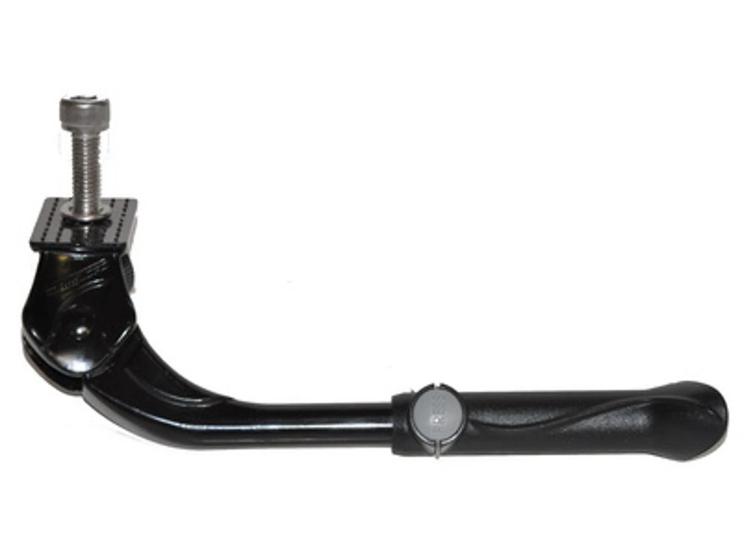Detta cykelstöd i aluminium ska monteras mitt under cykel, precis bakom vevlagret.