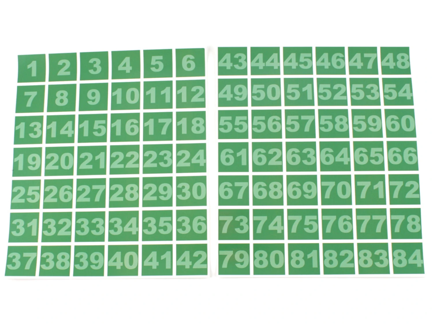 Siffror från 1 till 84. Varje klistermärke bestående av ett nummer mäter 3 x 3 cm.