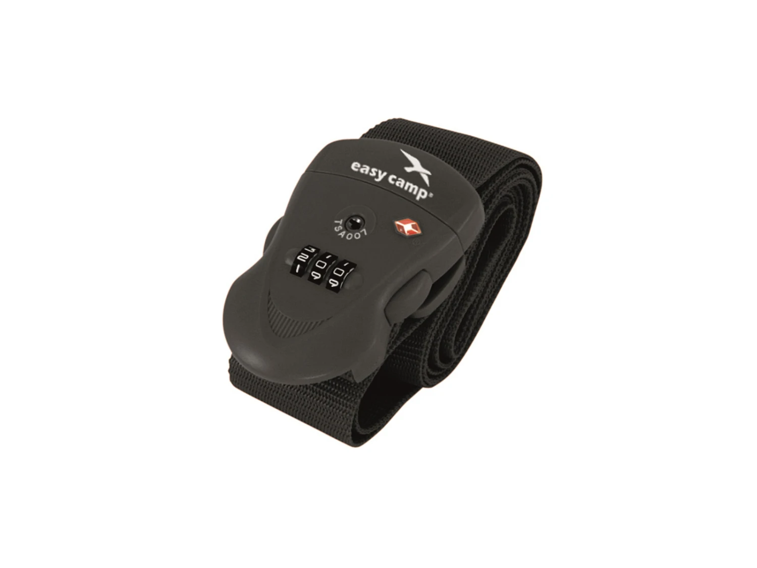 Denna bagageband från Easy Camp är säkerhetsgodkänd av US Transportation Security Administration. Remmen har ett kombinationslås med en tresiffrig kod. Låset är utformat så att flygplatspersonal kan öppna låset för att kontrollera bagaget utan att skada varken remmen eller låset.