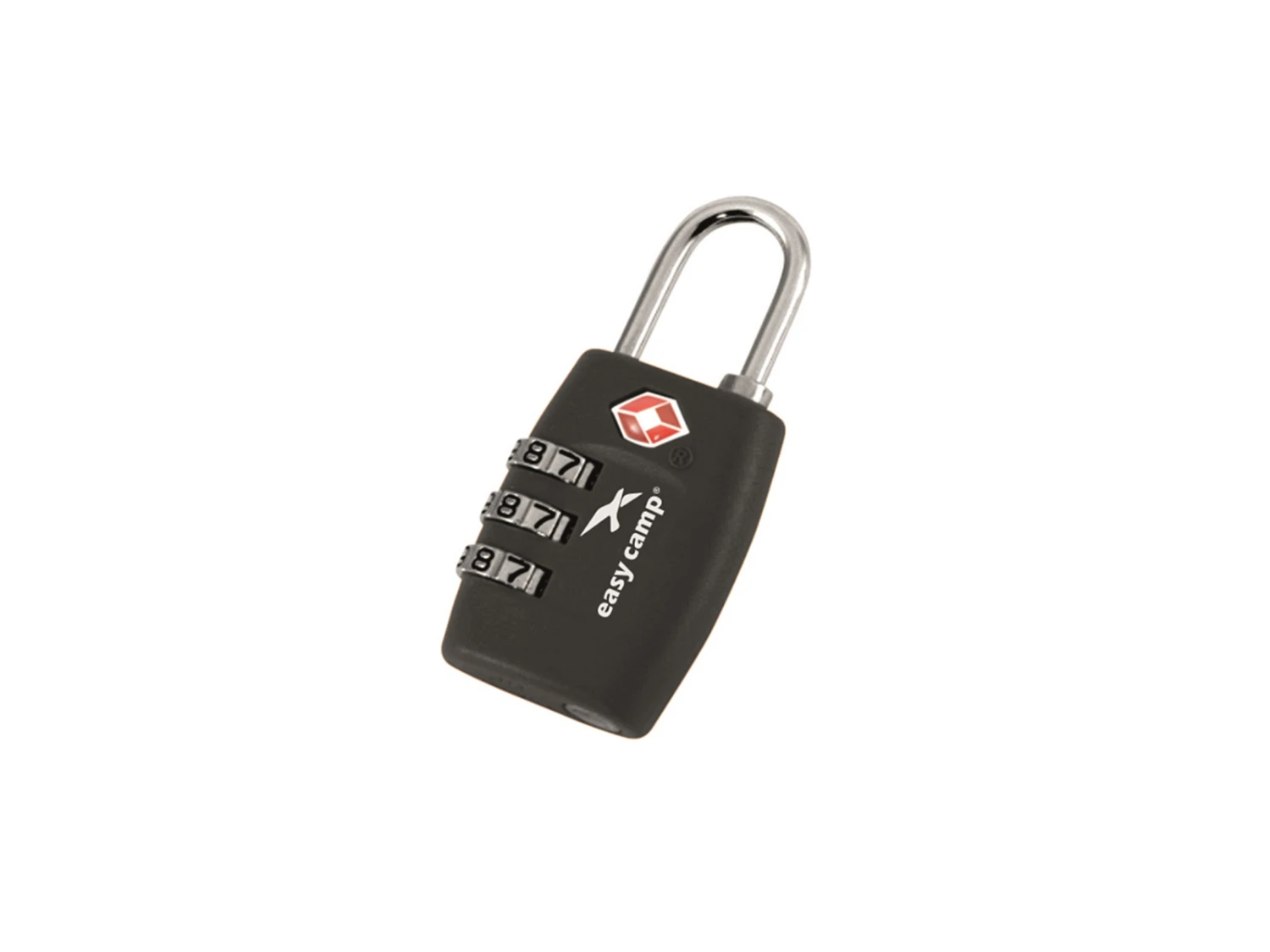 Säkert litet hänglås från Easy Camp som har godkänts av säkerheten av TSA, US Transportation Security Administration. Detta hänglås använder ett tresiffrigt kombinationslås som är utformat för att professionell flygplatspersonal ska kunna öppna låset utan att skada det – och sedan stänga det igen.
