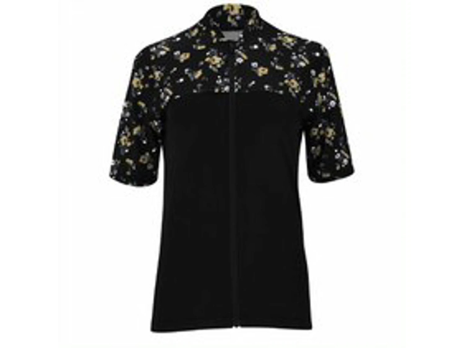 Modellen är klassisk svart med fint blommotiv på axlar och ärmar. Reflexdetaljer säkerställer ökad synlighet i trafiken.