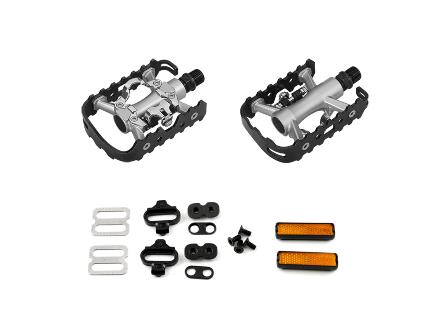 Denna pedal ger dig möjligheten att kombinera cykling i vanliga skor och cykelskor i en och samma pedal. Denna pedal har en vanlig trampyta på ena sidan, där vanliga skor kan användas. Den andra sidan av pedalen är utvecklad med SPD-klicksystem och här kan cykelskon användas. Därmed utnyttjas den fördel det ger att vara fastspänd i pedalerna. Du har hela tiden möjligheten att komma loss från pedalen när du vill. Du ska vara vrida foten ut mot sidan och därmed är du loss. Fördelen är att man kan cykla längre och snabbare. Dessutom blir man inte så trött och uppnår mer stabilitet samt kontroll över cykeln. Priset är för 1 set pedaler!
