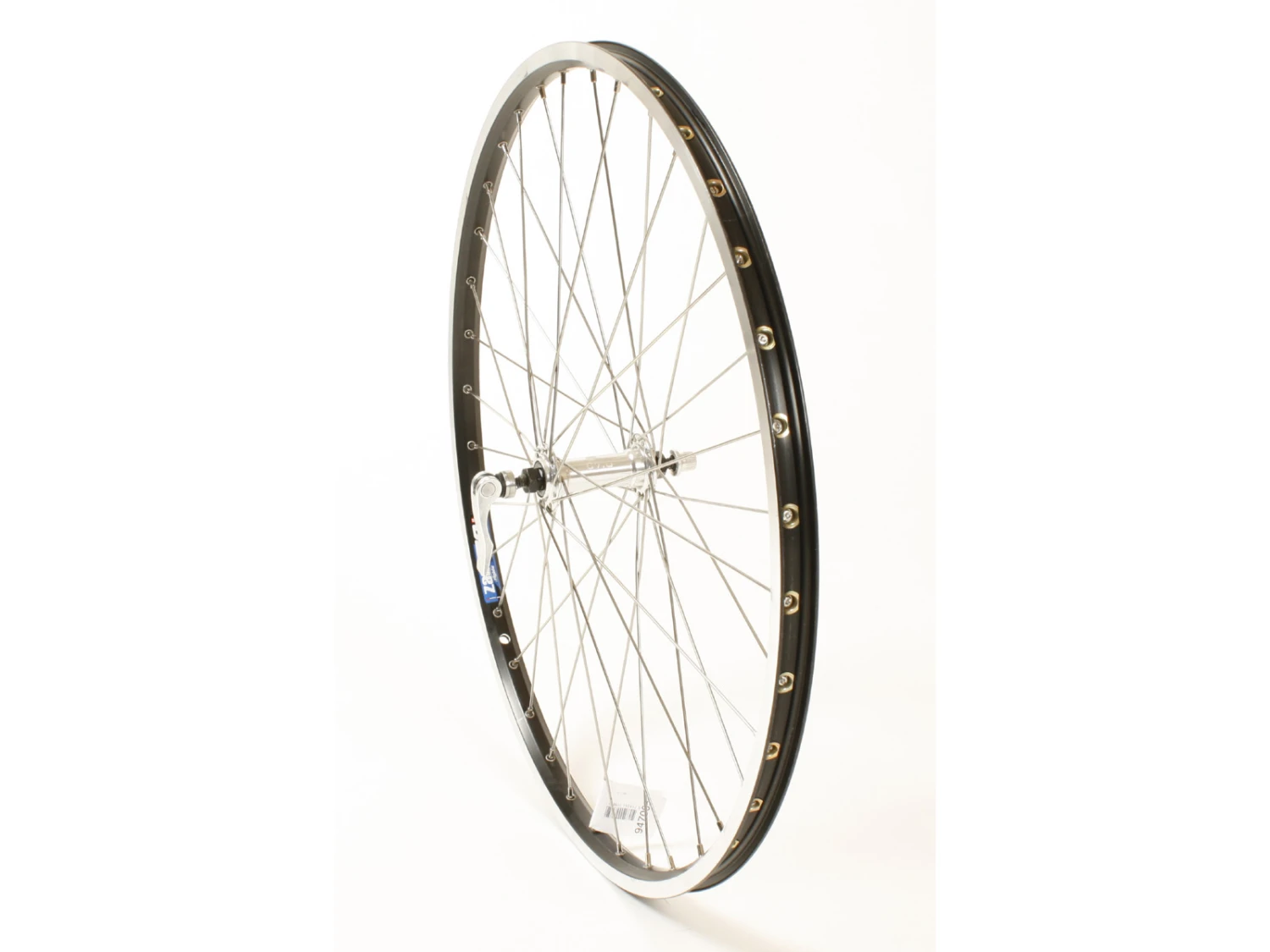 Framhjul med svart fälg i aluminium 24mm bred utvändig yttre och nav i glansigt aluminium och med 36 st. rostfritt stål ekrar 2mm tjocklek. Hjulet är i snabb spänning. Dubbel bottenkant med rostfritt 2,0 mm ekrar tomt Fornav Connect 7.0 Silver för snabb utgåva.