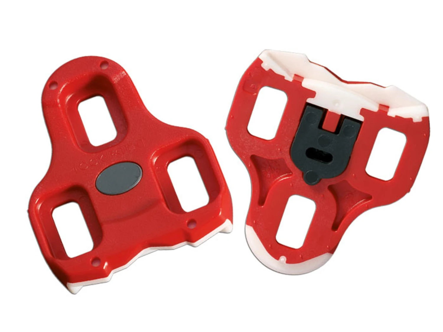 Original röda Look Keo-klossar, som har 9 graders rörelsefrihet och rekommenderas endast till nybörjare samt vissa cykelmotionärer. Flera elitcyklister använder också röda klossar på grund av flexibiliteten är rörelsen åt sidorna som är mer skonsam för cyklistens knä.