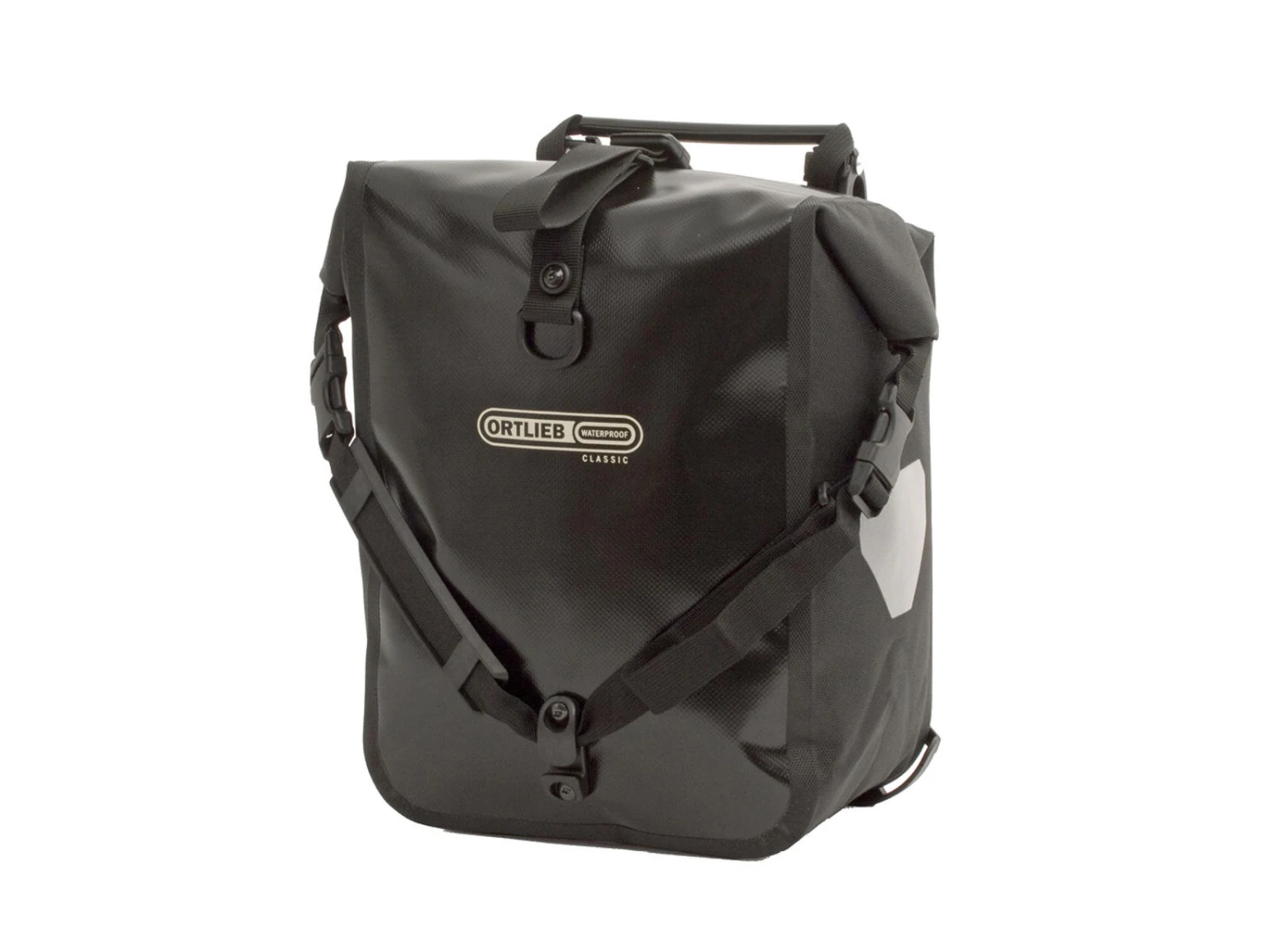 Ortlieb är känt för sin höga kvalitet i cykelväskor, där de flesta är helt eller delvis vattentäta. Denna Front-Roller Classic-sats är utrustad med stora 3M-reflektorer som bidrar till ökad sikt både fram och bak.