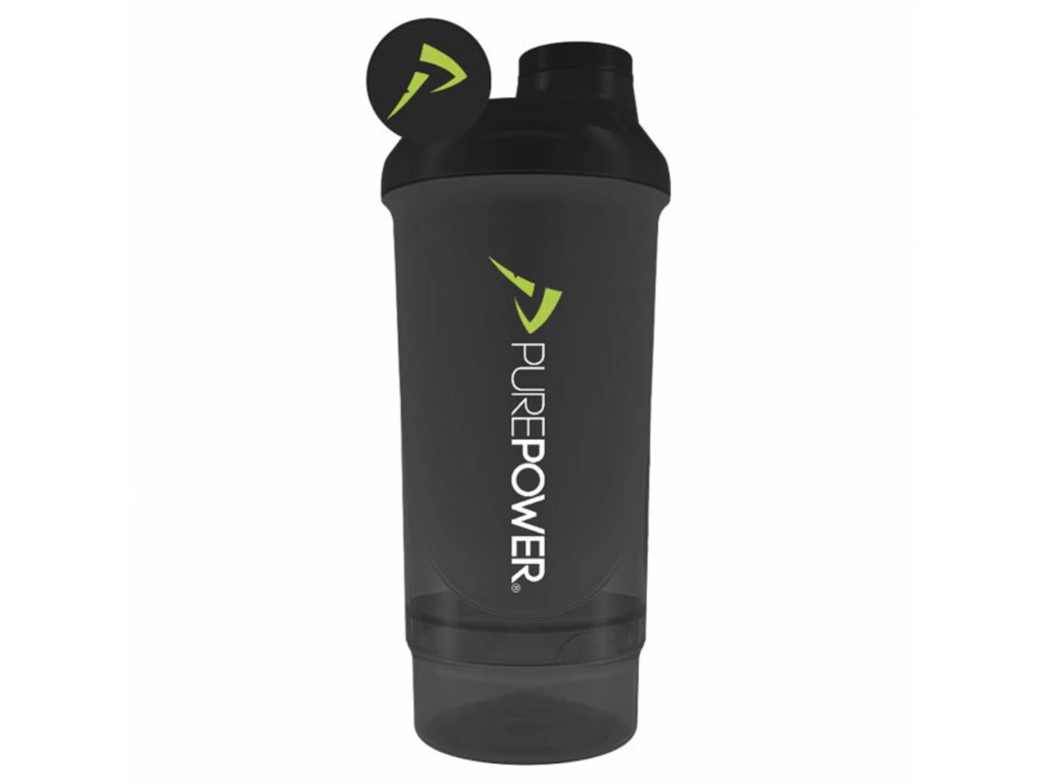 Med denna shaker från PurePower får du en shakej med plats till 150 ml pulver i botten. Utöver detta fungerar den precis som övriga shakers på marknaden. Botten gör det möjligt att blanda en shake hemma och fortfarande förvara pulver till en shake efter träningen. Om du inte vill använda botten så kan du bara skruva av den och lämna den hemma.