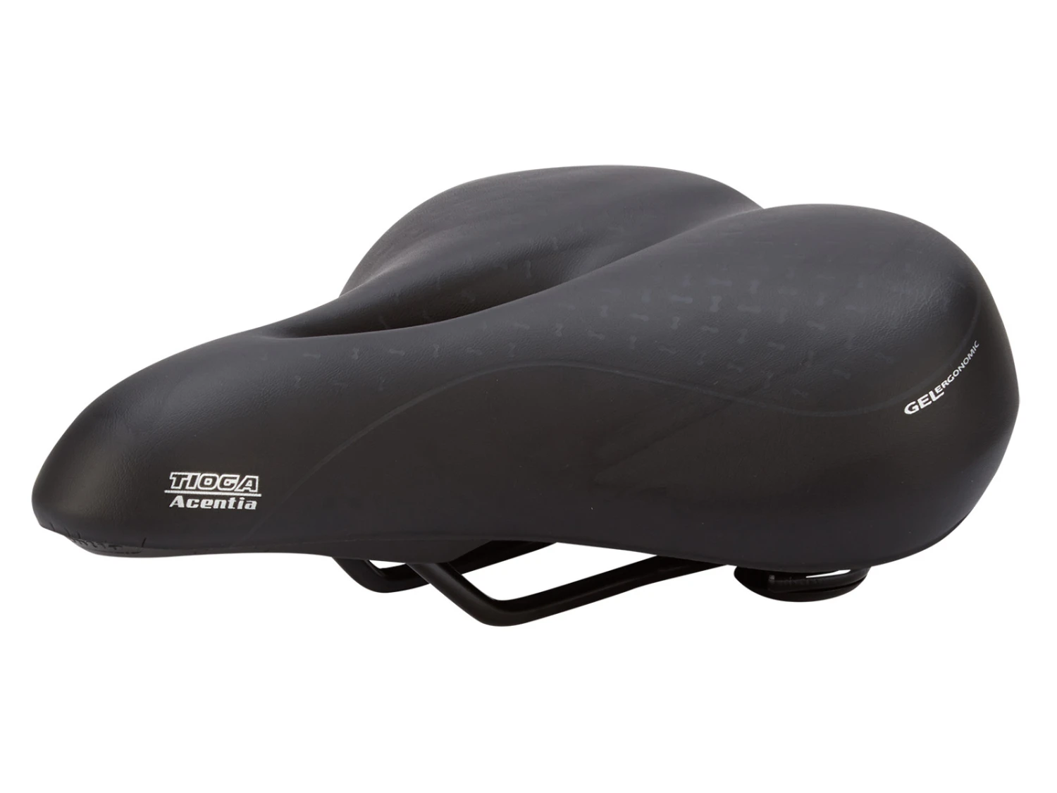 Tioga Acentia sadelmodell Pax Aura för cyklisten som vill ha en extra bred komfortsadel, som är konstruerad med gelinsatser, vilket ger mer komfort och ett bekvämt stöd mot sittbenet. Denna modell har ett hål i mitten av sadeln för extra komfort.