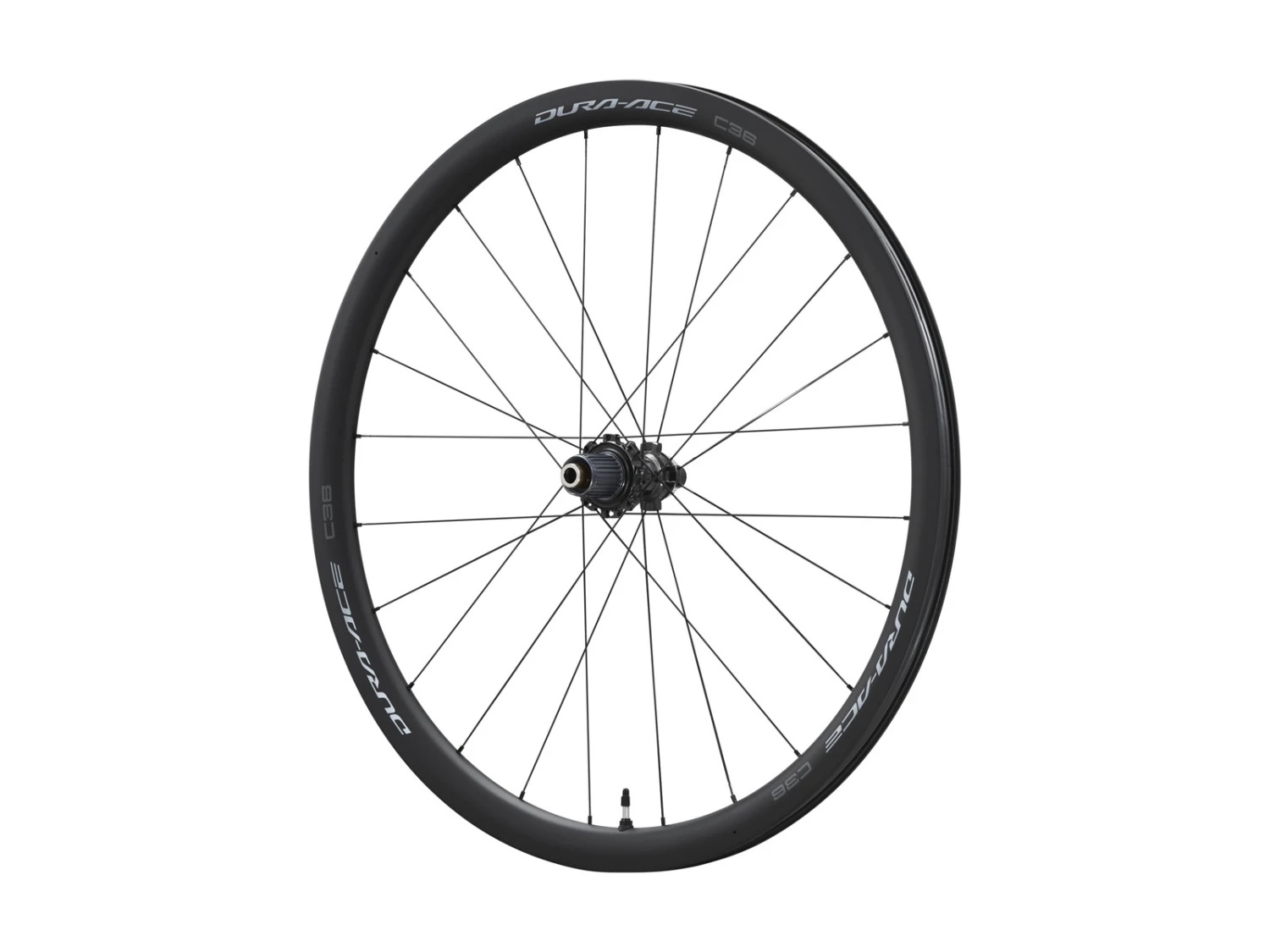 Detta Shimano Dura Ace -bakhjul tillhör Shimano 12 -växelkomponenterna och används för landsvägscyklar. Hjulet har en 36 mm hög kolprofil och för användning med slanglösa däck, E-Thru-axel och hydrauliska skivbromsar, varav rotorn måste ha ett mittlåssystem. Hjulet passar 12-växlad kassett typ HG Spline L2 från Shimano Dura Ace eller Shimano Ultegra.