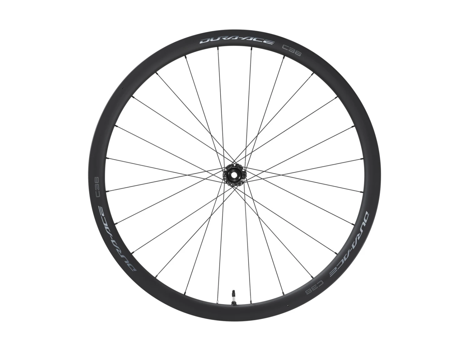 Detta Shimano Dura Ace -framhjul tillhör komponenterna i Shimano 12 -växlar och används för landsvägscyklar. Hjulet har en 36 mm hög kolprofil och för användning med slanglösa däck, E-Thru-axel och hydrauliska skivbromsar, varav rotorn måste ha ett mittlåssystem.
