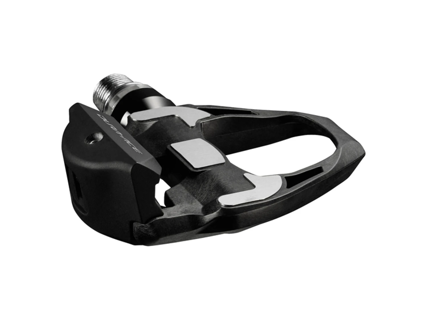 Denna Shimano Dura Ace pedal modell PD-R9100 är den lättaste Dura Ace-pedalen. Själva pedalen är utförd i karbon-material och axeln är i nickel chromoly-stål. Trampytan är bred och ger optimal stabilitet samt maximal kraftöverföring. Dessutom är pedalen monterad med en hållbar rostfri platta, som reducerar flex och minskar slitage. Brett placerade kullager gör att belastningen fördelas och stabilitet samt styrka ökas.