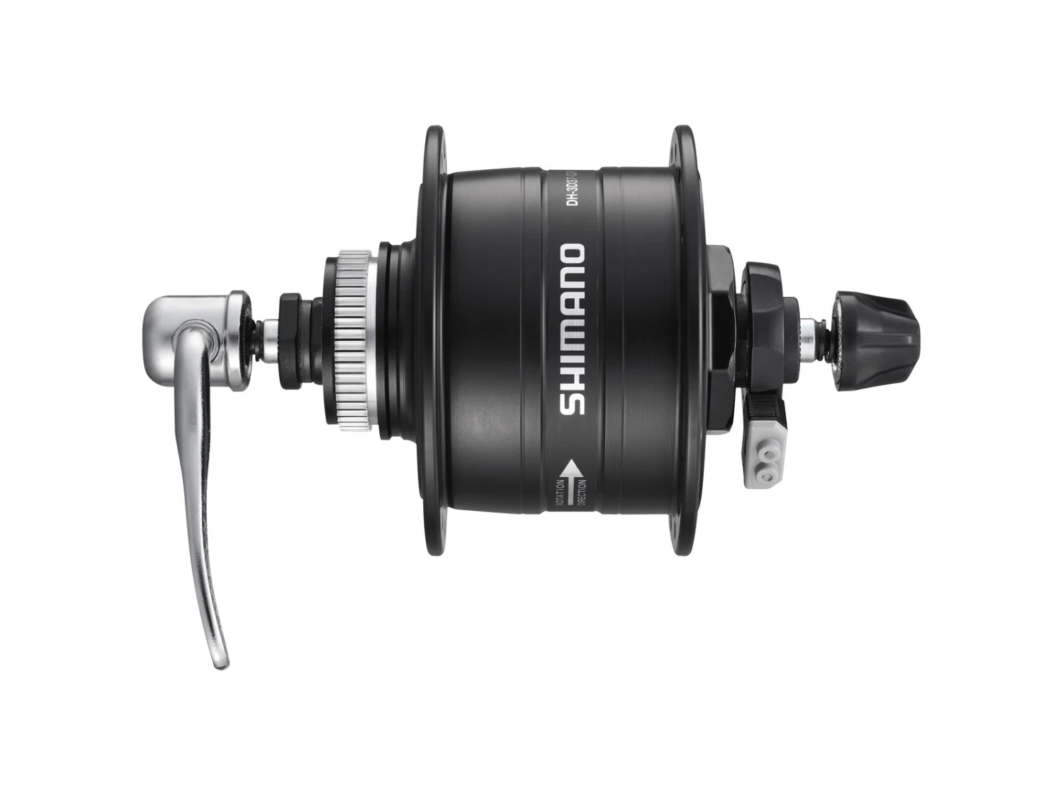 Shimano Dynamo framnav modell DH-3D37 – 6V / 3W med snabblåsning används på cyklar där även skivbromsar används. Navet passar skivbromsrotorn med mittlås. Navet är avsett för cyklar där generatorn ska ge ljus både fram och bak på cykeln.