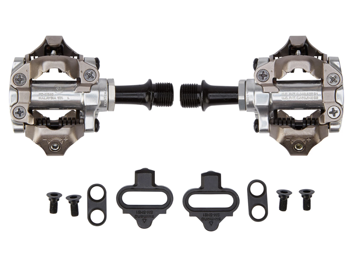 Shimano PD-M540 pedal i silver med dubbelt klick-system. Pedalen är designad så att man undviker att för mycket lera m.m. sätter sig fast i pedalen. Pedalens bindningar (där klossarna klickas i) kan justeras, så man själv bestämmer hur stramt det är att få av skorna från pedalen igen.