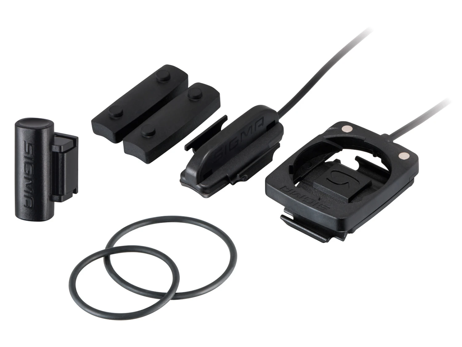 Detta kabelset med magnet från Sigma innehåller en sensor med kabel till din Sigma cykeldator, samt en hållare till styret.