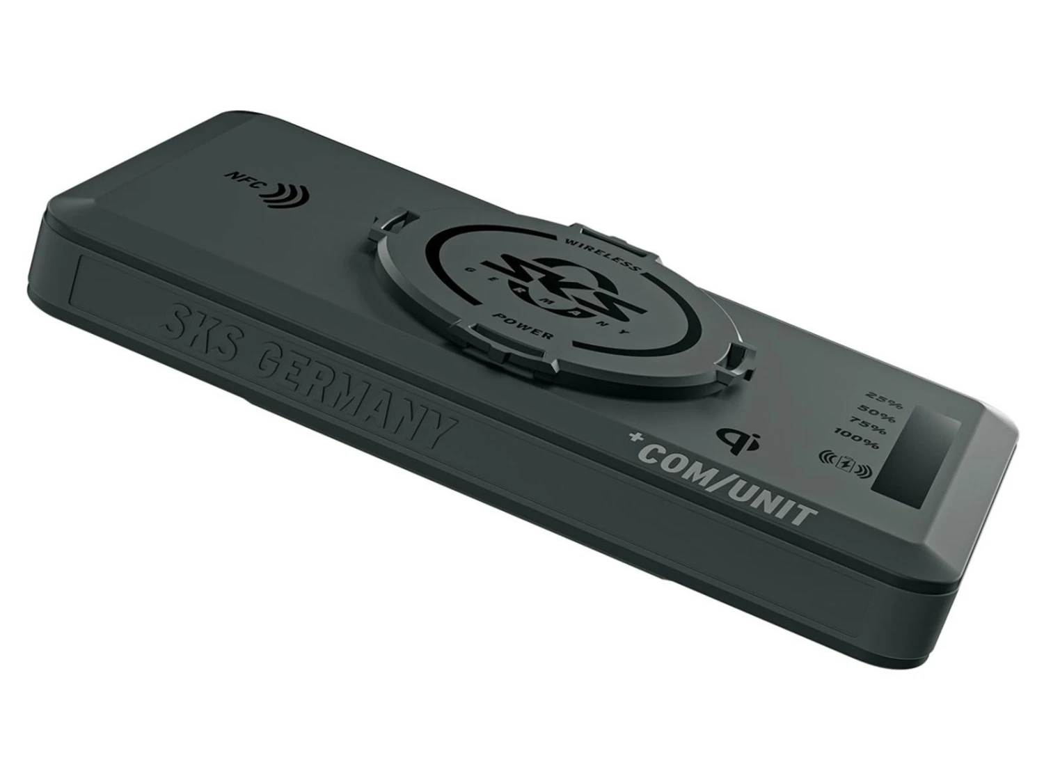 Denna SKS +Com laddstation/powerbank kan användas tillsammans med mobilskal från SKS och gör det möjligt att ladda din enhet trådlöst sittandes på cykeln. (detta kräver att din mobiltelefon kan laddas trådlöst – om så inte är fallet kan du ansluta din enhet till laddstationen via USB-kabel).