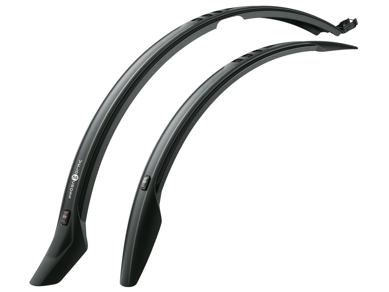 Dessa SKS Velo 55 Cross stänkskärmar passar till 26″, 27″, 28″ och 29″ hjul och med en bredd på 55 mm så passar de till trekking- cross- och fitnesscyklar. Stänkskärmarna ger dig ett maximalt skydd, oavsett om du färdas i stan eller off-road.