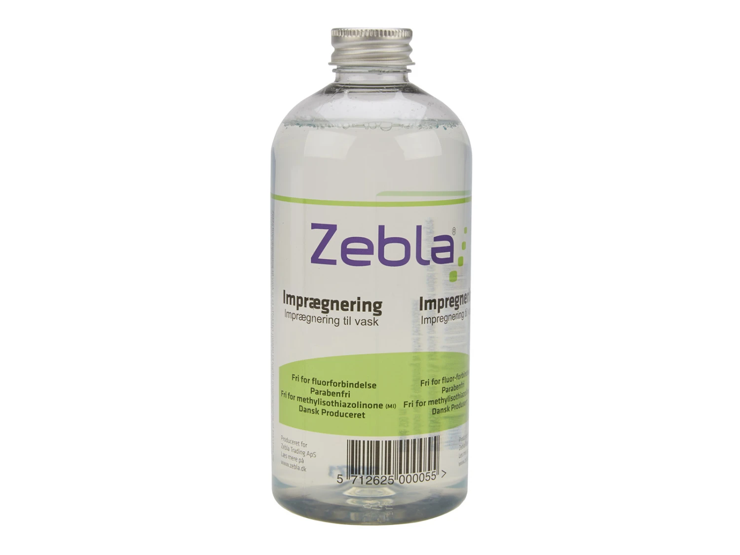Zebla impregnering till tvätt, är en luktfri impregnering som skapar eller återskapar vattentäthet i kläderna vid tvätt. Utöver den goda impregneringsförmågan bevarar Zebla även materialets smidiga och andningsbara egenskaper medan det ger en smuts- och vattenavvisande effekt.